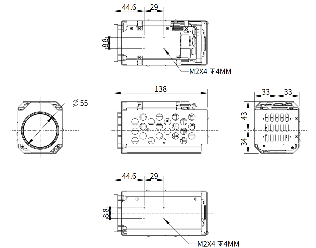 4Pin Etherneti port, 6pin seeria- ja toiteport, 5pin helisadam. 30pin mipi |